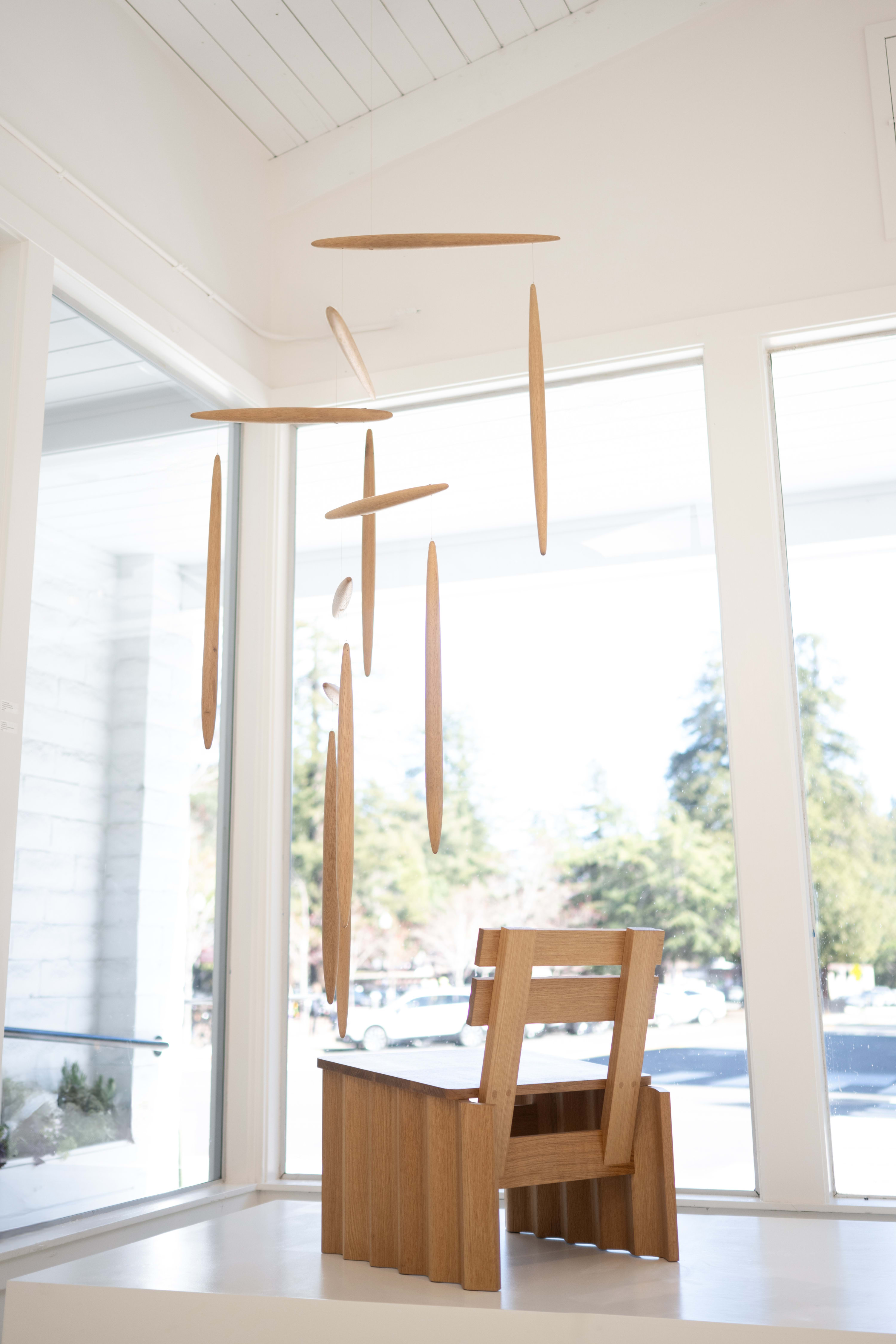 Many works included explore place through subject matter, ranging from ice melting in a muggy Los Angeles studio, to a lulling, hazy beach scene, to the rolling hills of wine country, or color studies of the forest floors of Northern California. Other artists contemplate place through medium, such as California White Oak or lichen and mica from the California mountains. Other works engage and animate space in their design, like the mobiles by East Bay artist Emily Payne, which gently turn at the slighted gust of air to paint the walls with cast shadows. These works are conceptualizations of the artists’ experience of place, and their desire to create works that engage their place. The resulting works capture the mood of our shared home.